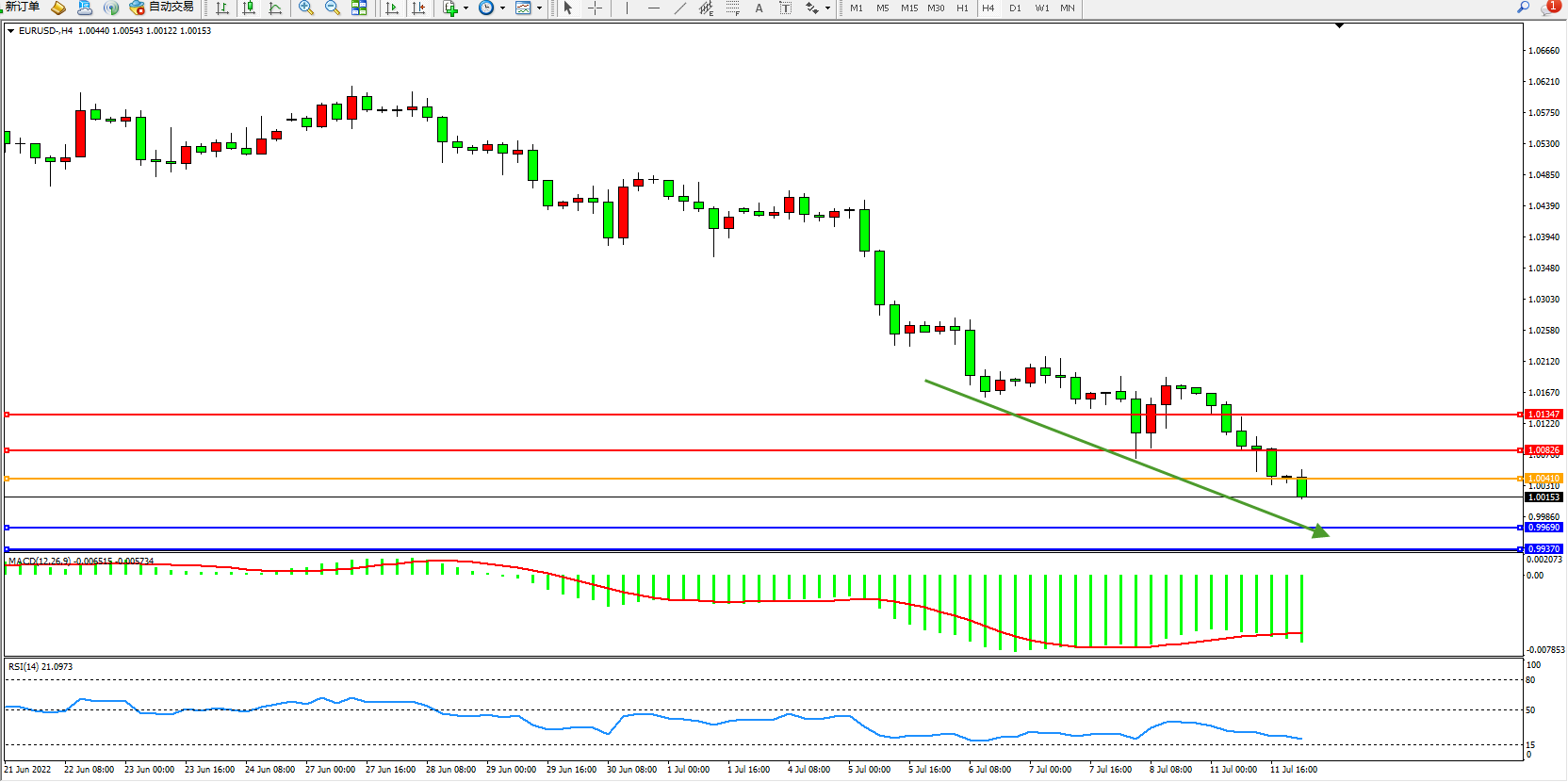 欧元兑美元维持1.00092附近震荡,欧元兑美元周一下滑至20年低点,并接近平价,,美国固定收益熊市的利率上个月达到顶峰,与2000年1月类似,当时欧元兑美元也跌破平价。
