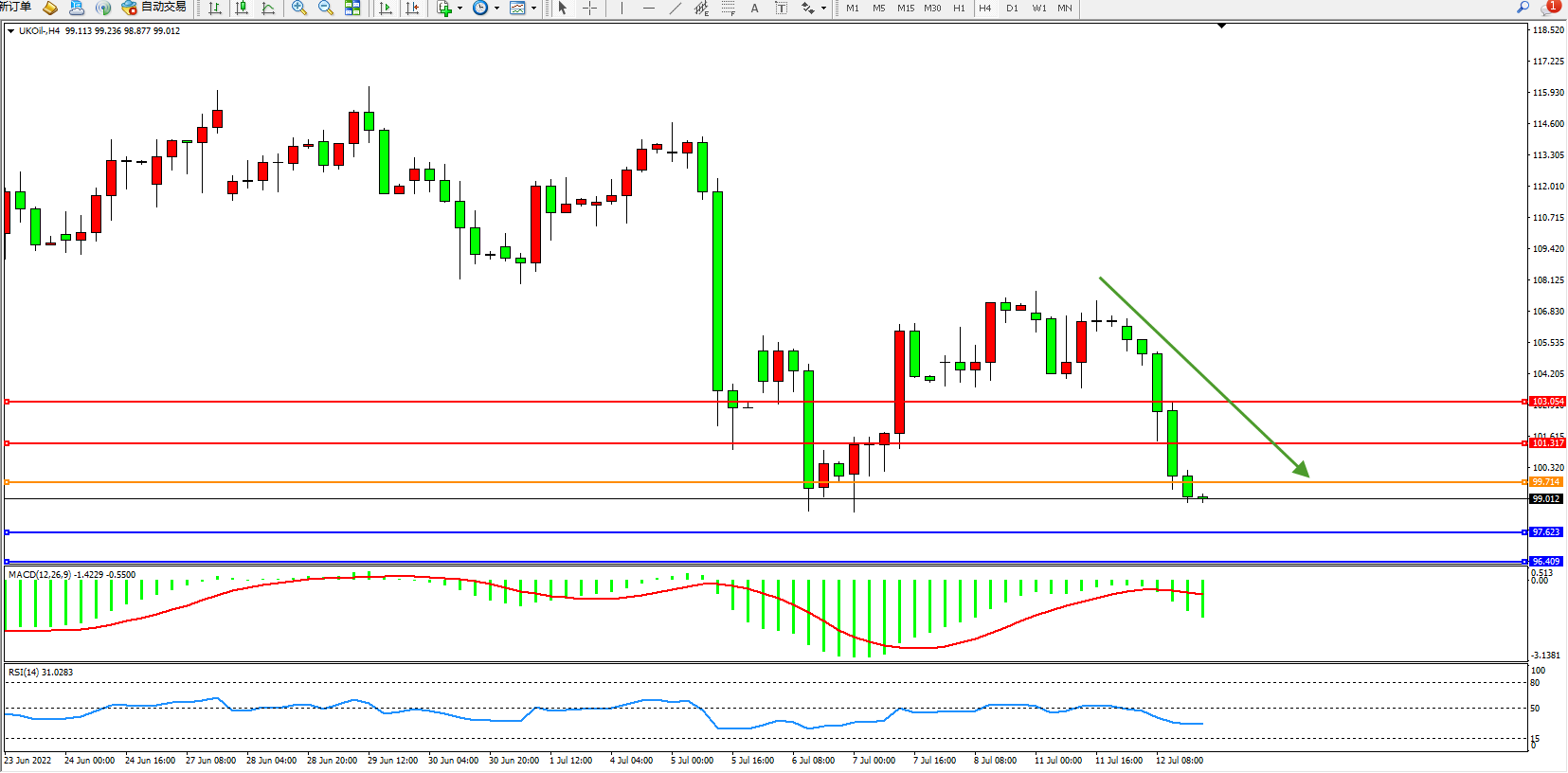 交易策略:99.714下方看跌,目标97.623、96.409