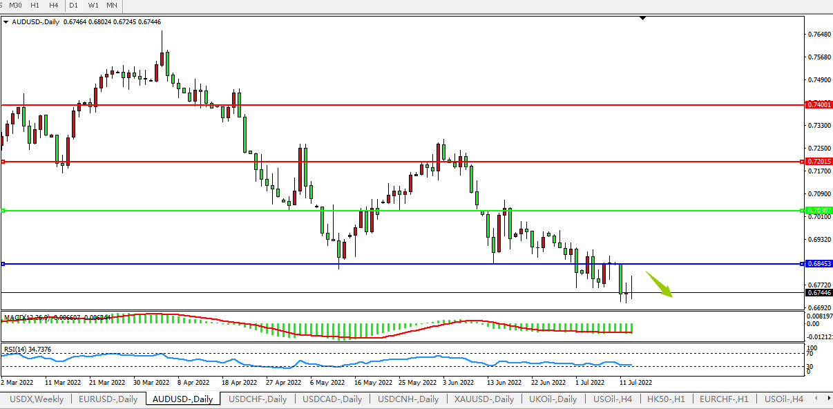日线图看:短期汇价持续弱势运行,MACD运行于0轴下方且量能持续放量,RSI小幅走升,预计汇价大概率将在反弹后进一步下行。