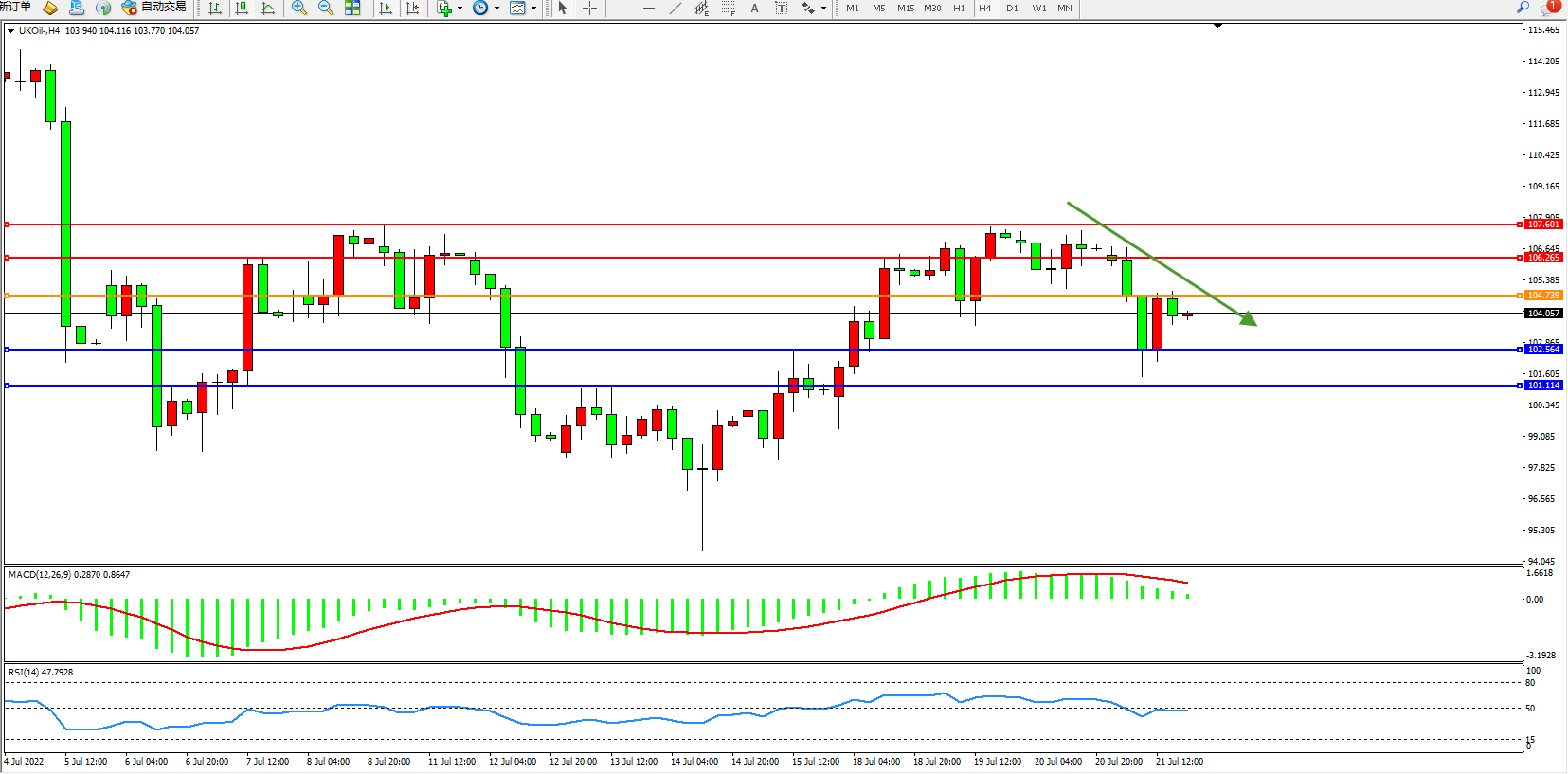 交易策略:104.739下方看跌,目标102.564、101.114