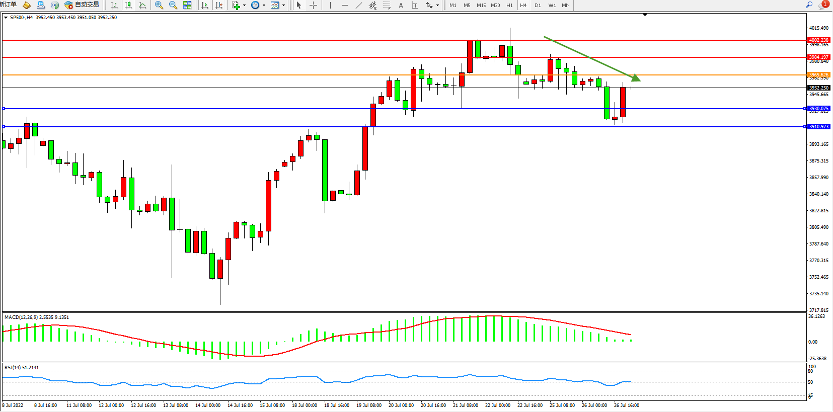 标普500指数7月26日(周二)收盘下跌46.46点,跌幅1.17%,报3920.38点;利率市场大量资金押注美联储主席鲍威尔对政策灵活性的需求将使波动率指标保持于高位水平。
