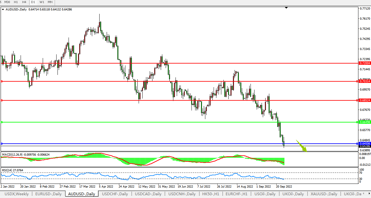 日线图看:短期汇价继续加速下行,MACD运行于0轴下方且量能放量,RSI继续走低,预计汇价大概率将在反弹后进一步下行。