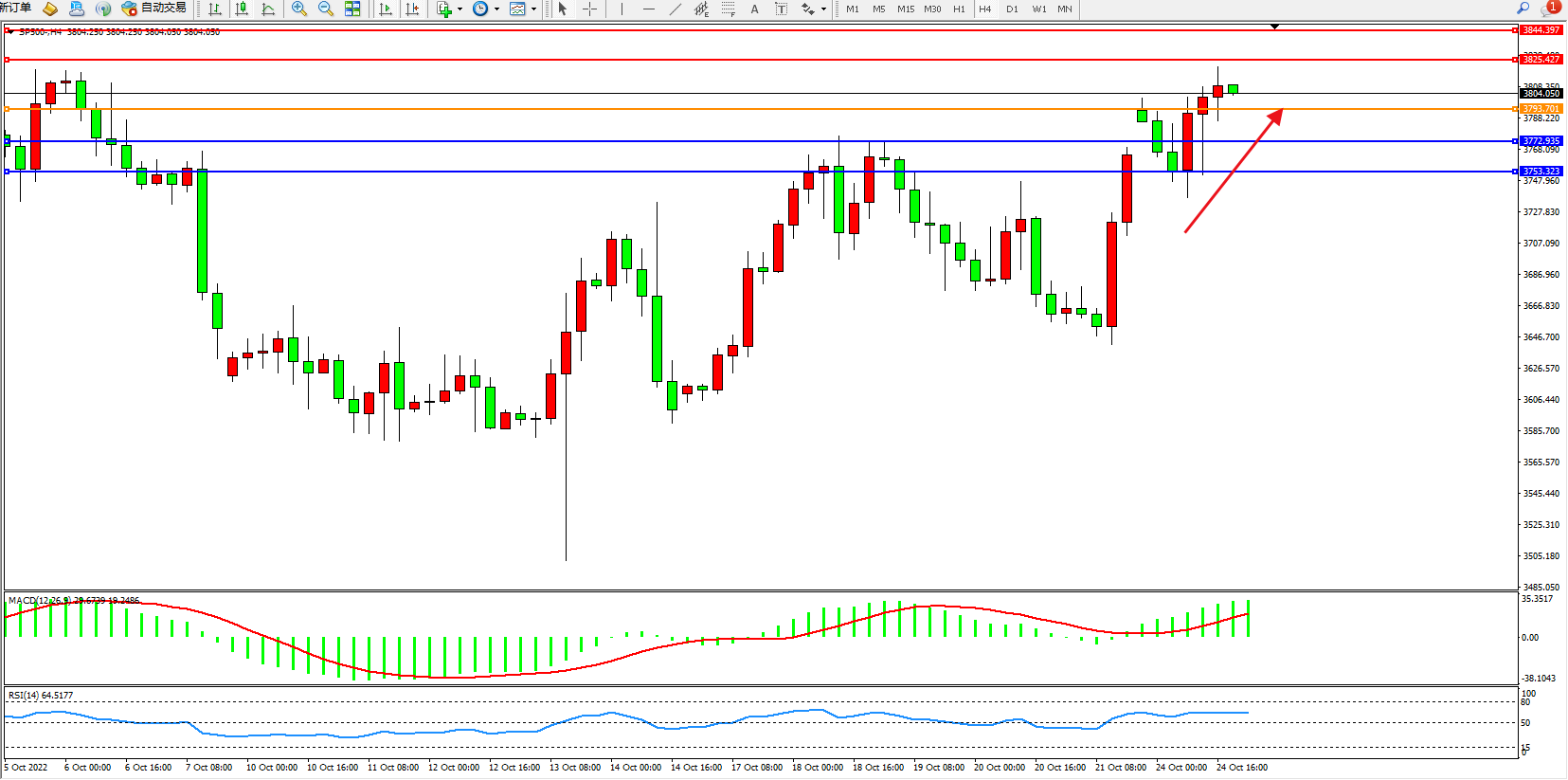 标普500指数10月24日(周一)收盘上涨46.49点,涨幅1.24%,报3799.24点;在通胀压力依然居高不下的同时,美国经济在第四季度收缩的风险加大。不过,有明显迹象表明,需求走弱正有助于缓和总体通胀率,未来几个月通胀率应会继续下降,尤其是如果利率继续上升的话。
