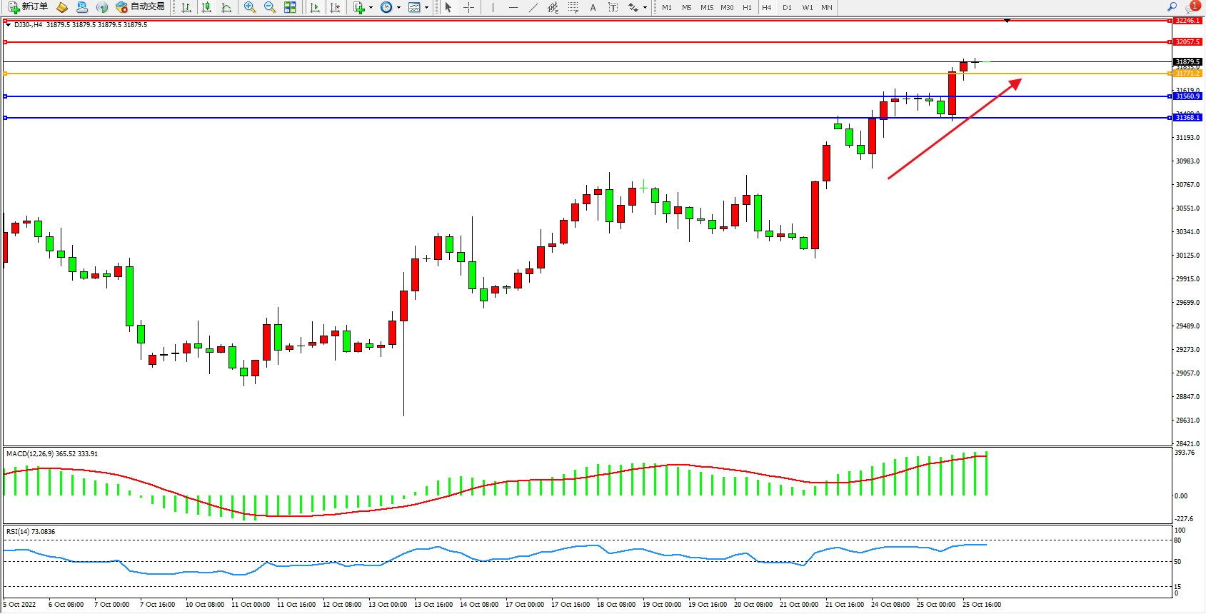 道琼斯指数10月25日(周二)收盘上涨337.12点,涨幅1.07%,报31836.74点;美国经济数据疲软引发更广泛衰退担忧,但依旧高位运行的通胀让投资者确信,美联储近期不会暂停加息脚步。美联储不一定非要见证更多裁员,但确实需要看到薪资增速下降。