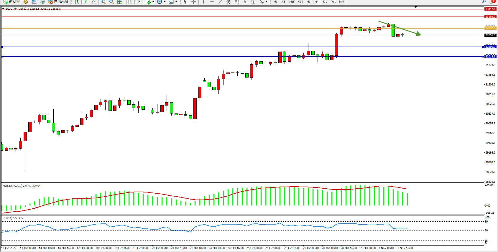 道琼斯指数11月1日(周二)收盘下跌82.12点,跌幅0.25%,报32650.83点;美联储将在周三(11月2日)结束为期两天政策会议,预计连续第四次加息75个基点,但可能讨论何时转向小幅加息。