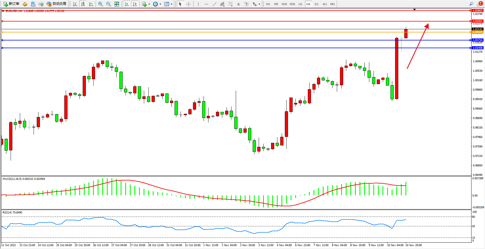 4小时图看:多头动力高位急速攀升后有继续上移迹象,短期看涨情绪笼罩,市场多头维持拉升走势,MACD指标处于多头区域高位上移,RSI指标处于多头区域震荡;