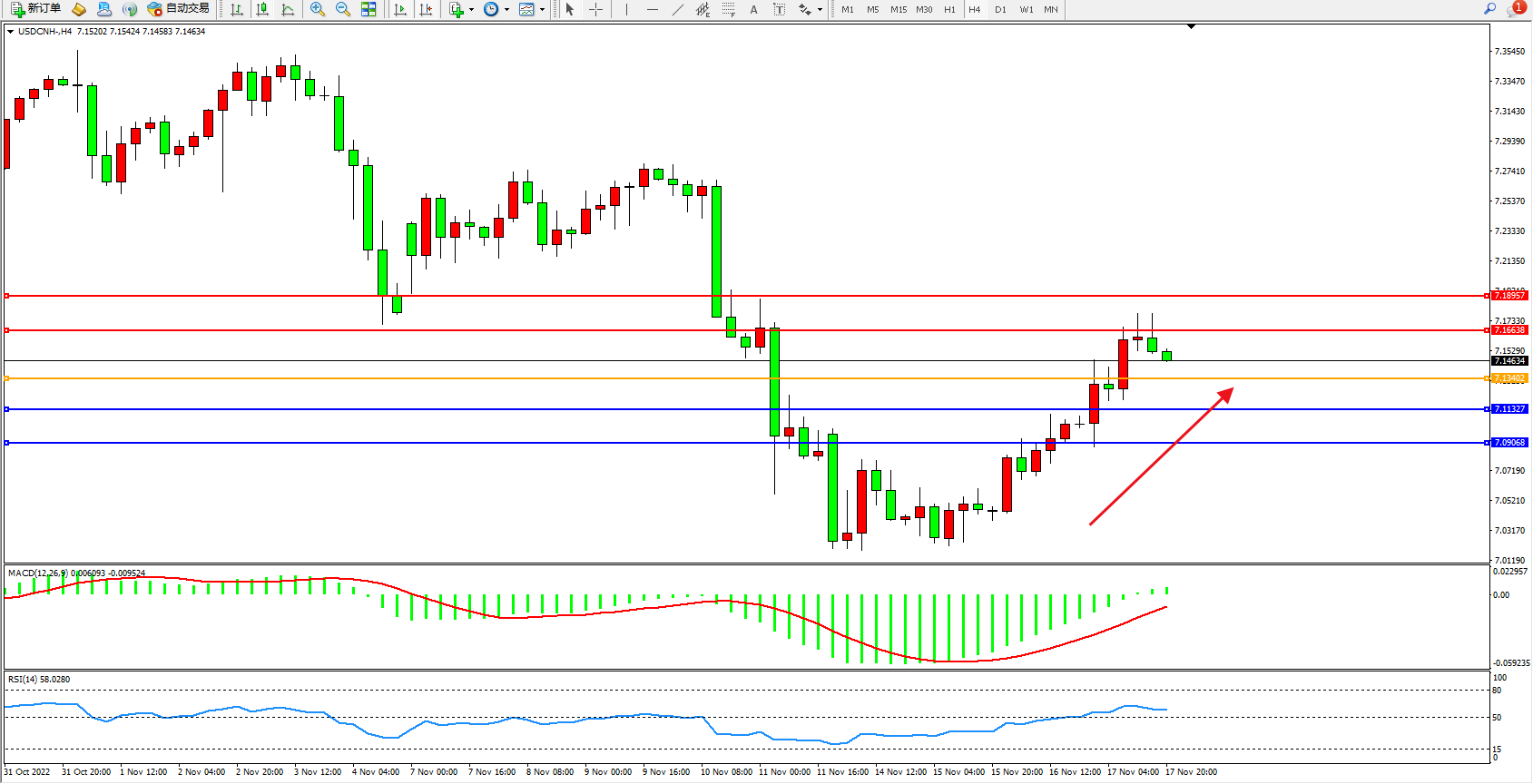 交易策略:7.13402上方看涨,目标7.16638、7.18957
