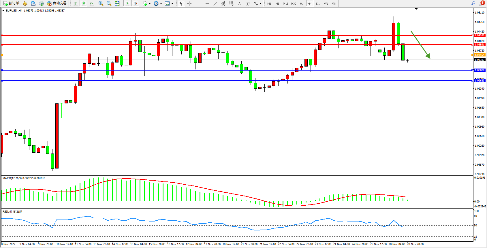 4小时图看:高位空头动力急速下挫,短期空头动力有伺机入场,向下移动,MACD指标处于0轴线上側弱势徘徊,RSI指标处于50均衡线下侧弱势整理;