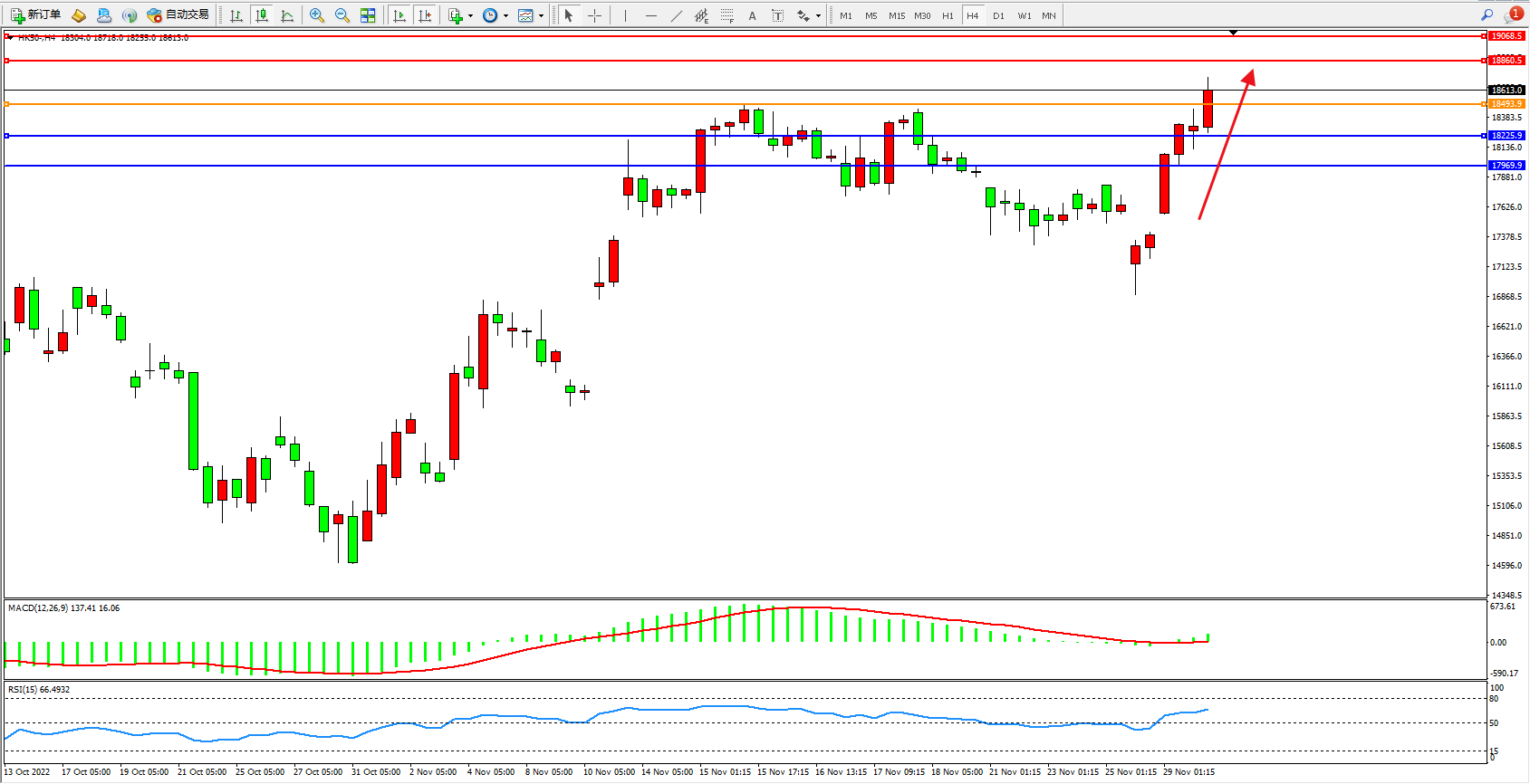 4小时图看:多头动力高位持续攀升,短期看涨情绪涌现,市场多头不断拉升中,MACD指标处于0轴线上側弱势上移,RSI指标处于50均衡线上側弱势整理;