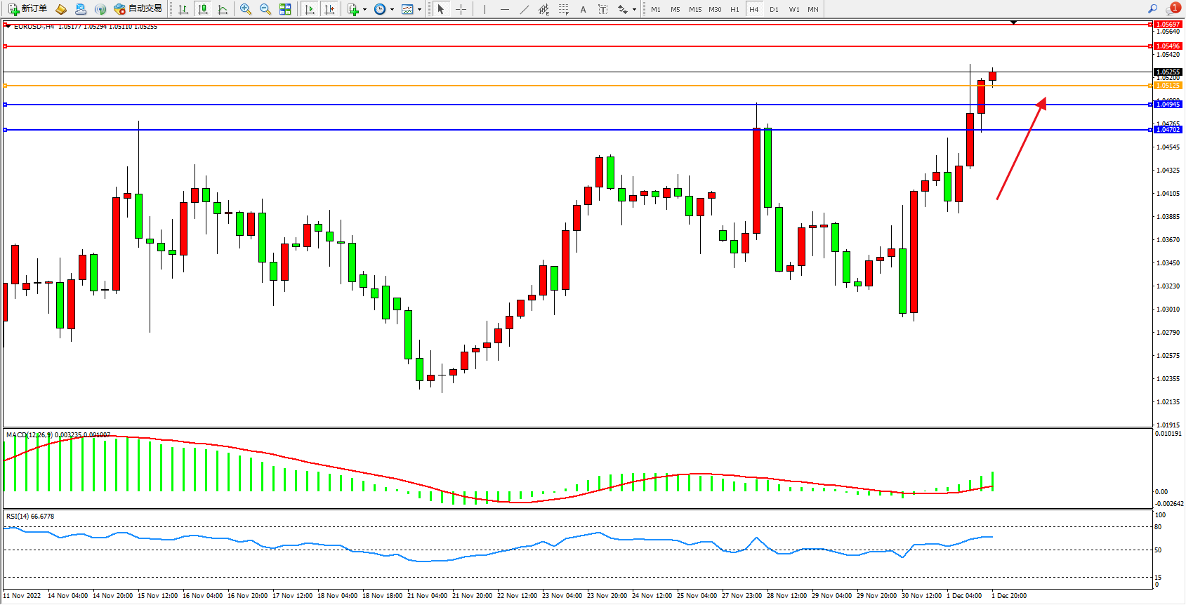 4小时图看:多头动力强势拉升上扬,短期看涨情绪涌现,MACD指标处于多头区域持续上移,RSI指标处于多头区域窄幅震荡中;