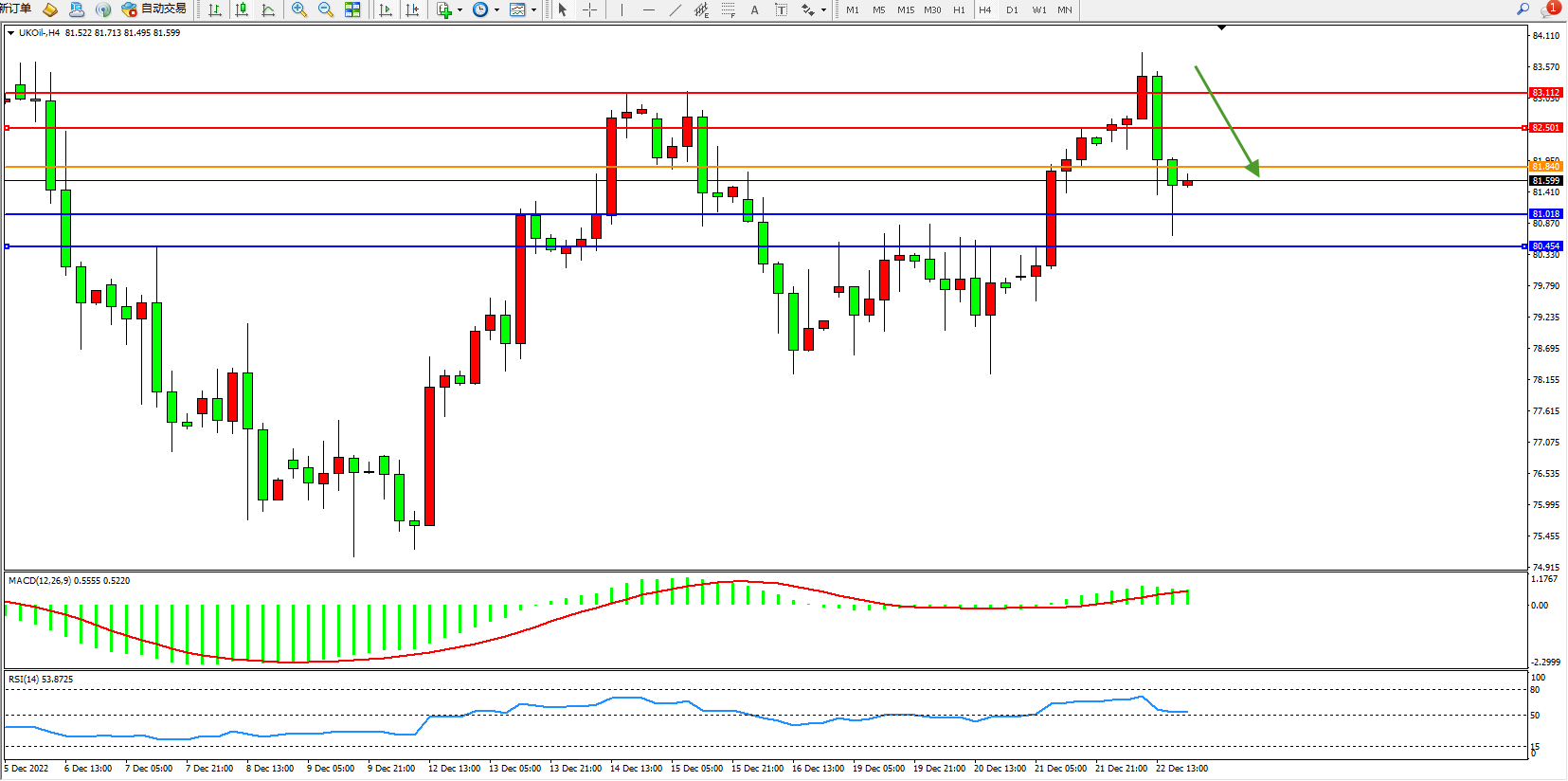 4小时图看:高位空头动力急速下挫,短期跌势或将延续,市场空头情绪态势良好,MACD指标处于多头区域整理,RSI指标处于50均衡线上側弱势徘徊;