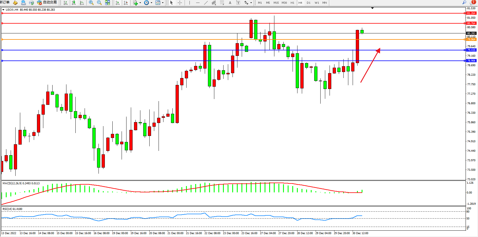 交易策略:79.964上方看涨,目标80.764、81.264