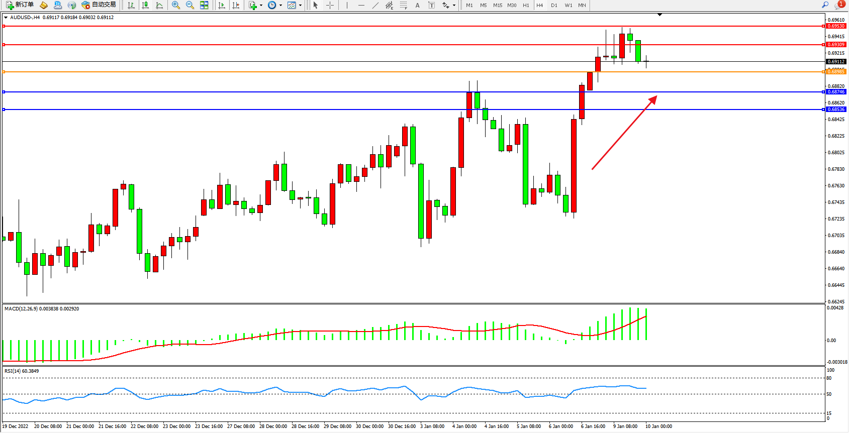 澳元兑美元维持0.69110附近震荡,市场缩减了对美国加息的预期,且中国边境开放预示着中国需求的最终复苏。澳元兑美最高触及0.6925,为8月31日以来新高。中国决定放宽对澳洲煤炭进口的限制,进一步助推了中国经济重新开放带来的提振效应。