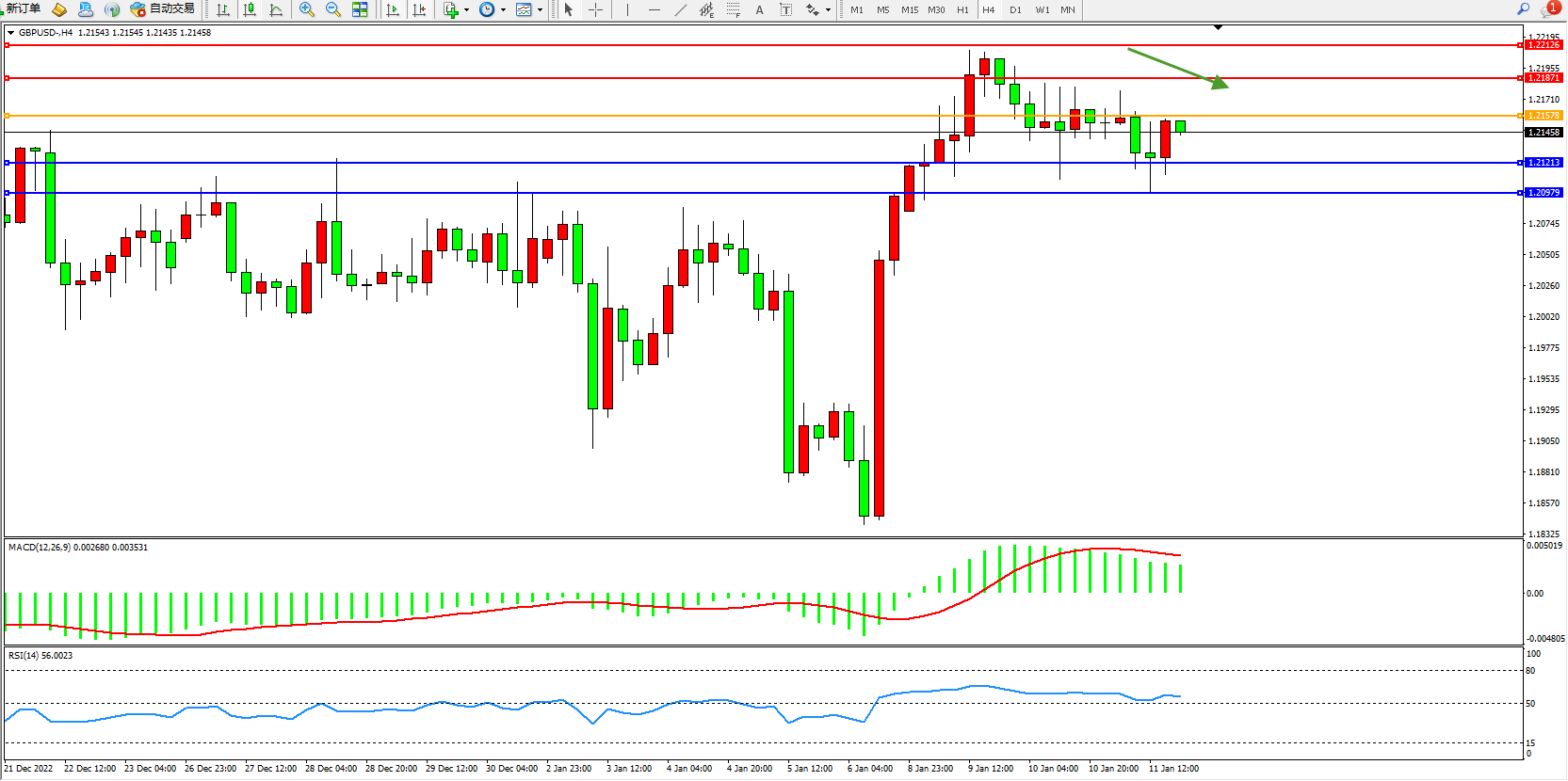 交易策略:1.21578下方看跌,目标1.21213、1.20979