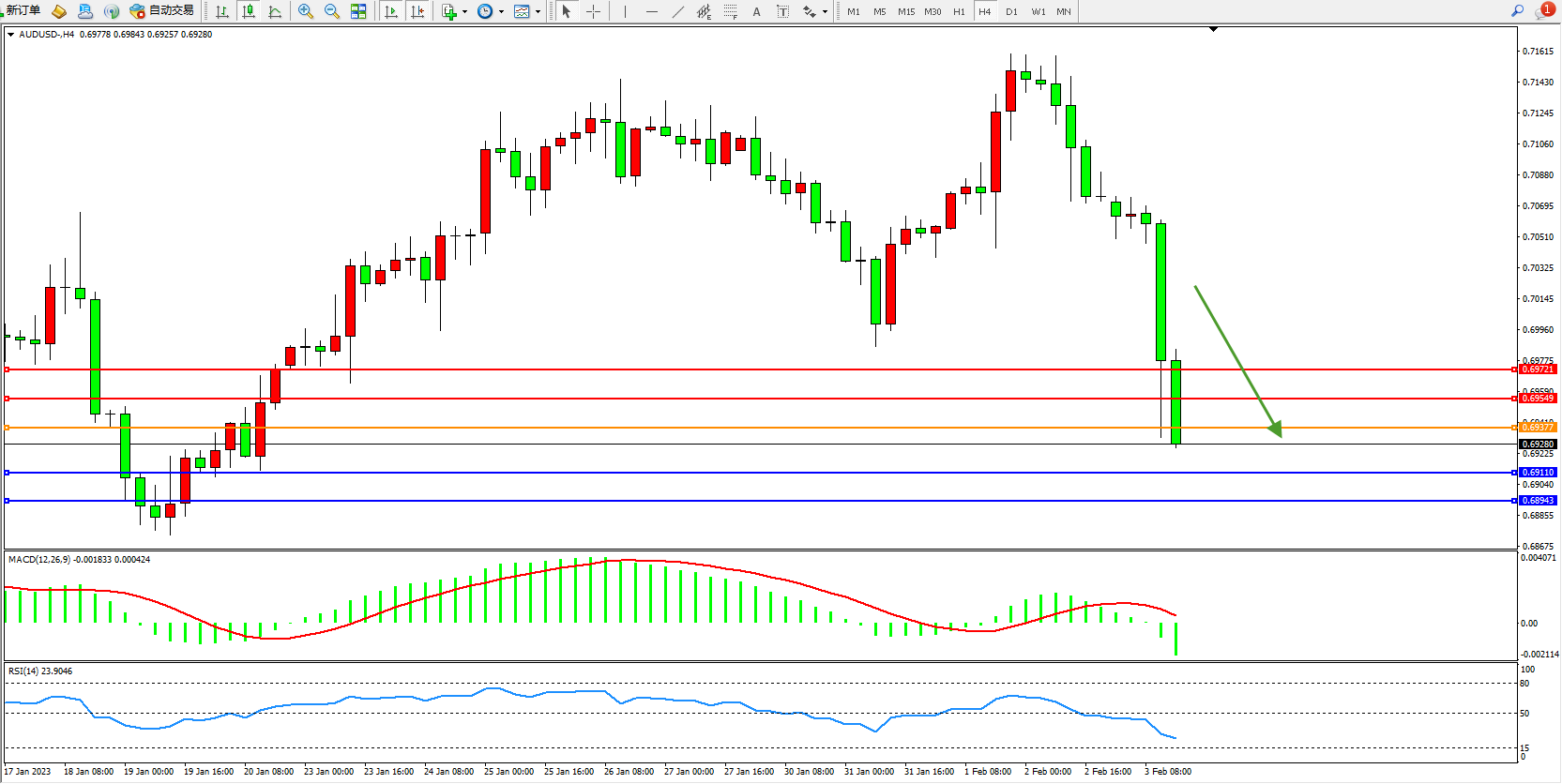 澳元兑美元维持0.69100附近震荡,路透调查:澳洲联储行预计将在3月底前将关键利率上调至至少3.60%(1月调查显示为6月底),31位经济学家中的30位表示,澳洲联储将于2月7日将现金利率提高25个基点至3.35%,预计澳洲联储把3.6%的利率水平从2023年一季度维持到年底。