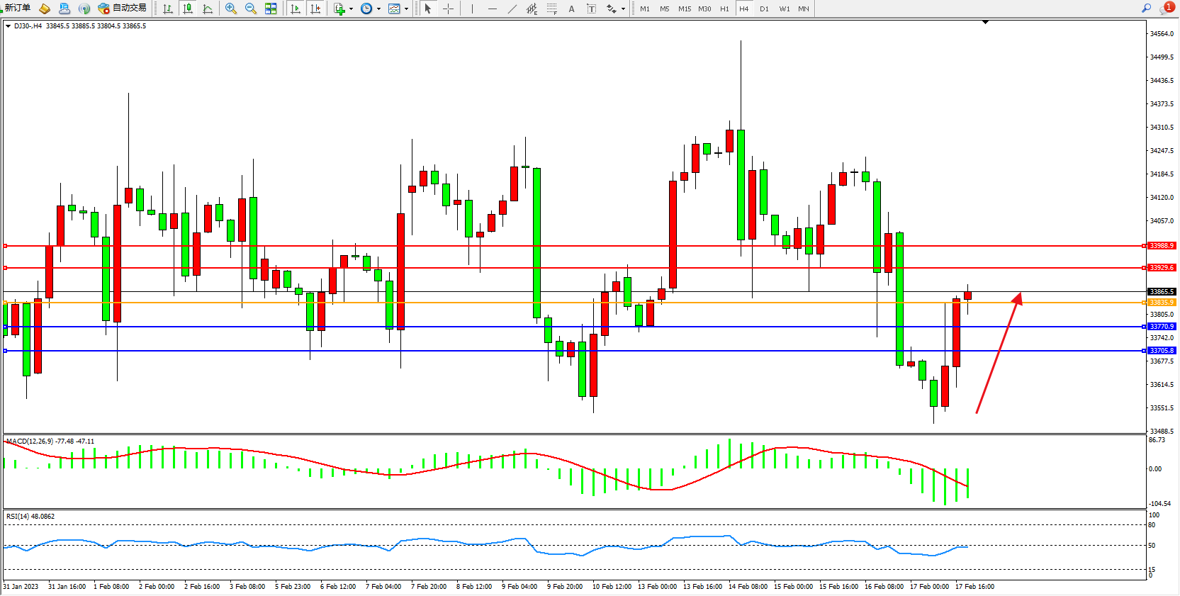 道琼斯工业平均指数收涨129.84点,涨幅0.39%,报33826.69点,本周累跌0.13%,连跌三周。美国1月谘商会领先指标中,制造业新订单、消费者对商业条件的预期和信贷条件的恶化抵消了劳动力市场和股票价格的优势,导致该指数在该月下降。