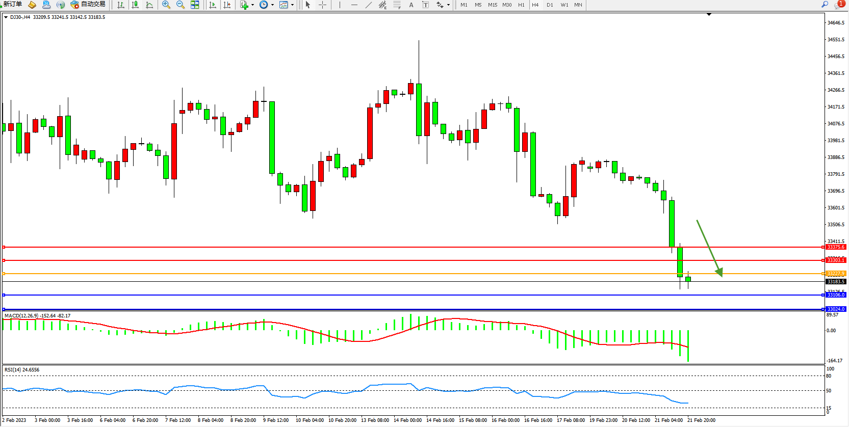 道琼斯指数2月21日(周二)收盘下跌696.31点,跌幅2.06%,报33130.38点;美国2月Markit制造业PMI初值 47.8,预期47.1,前值46.9,服务业PMI初值创8个月新高,综合PMI初值创8个月新高。