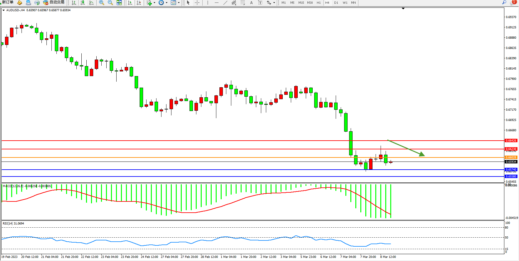 交易策略:0.66028下方看跌,目标0.65740 0.65580