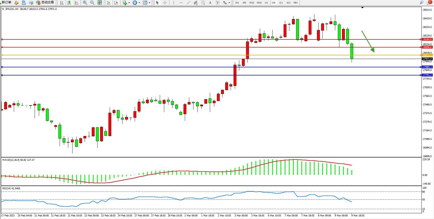 4小时图看:空头动力维持震荡下移,短期空头情绪笼罩,市场整体处于偏弱势,MACD指标处于多头区域持续整理下移,RSI指标处于50均衡线下侧徘徊;