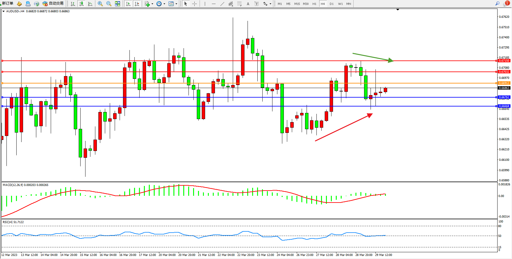 交易策略:0.66912下方看跌,目标0.66762  0.66666