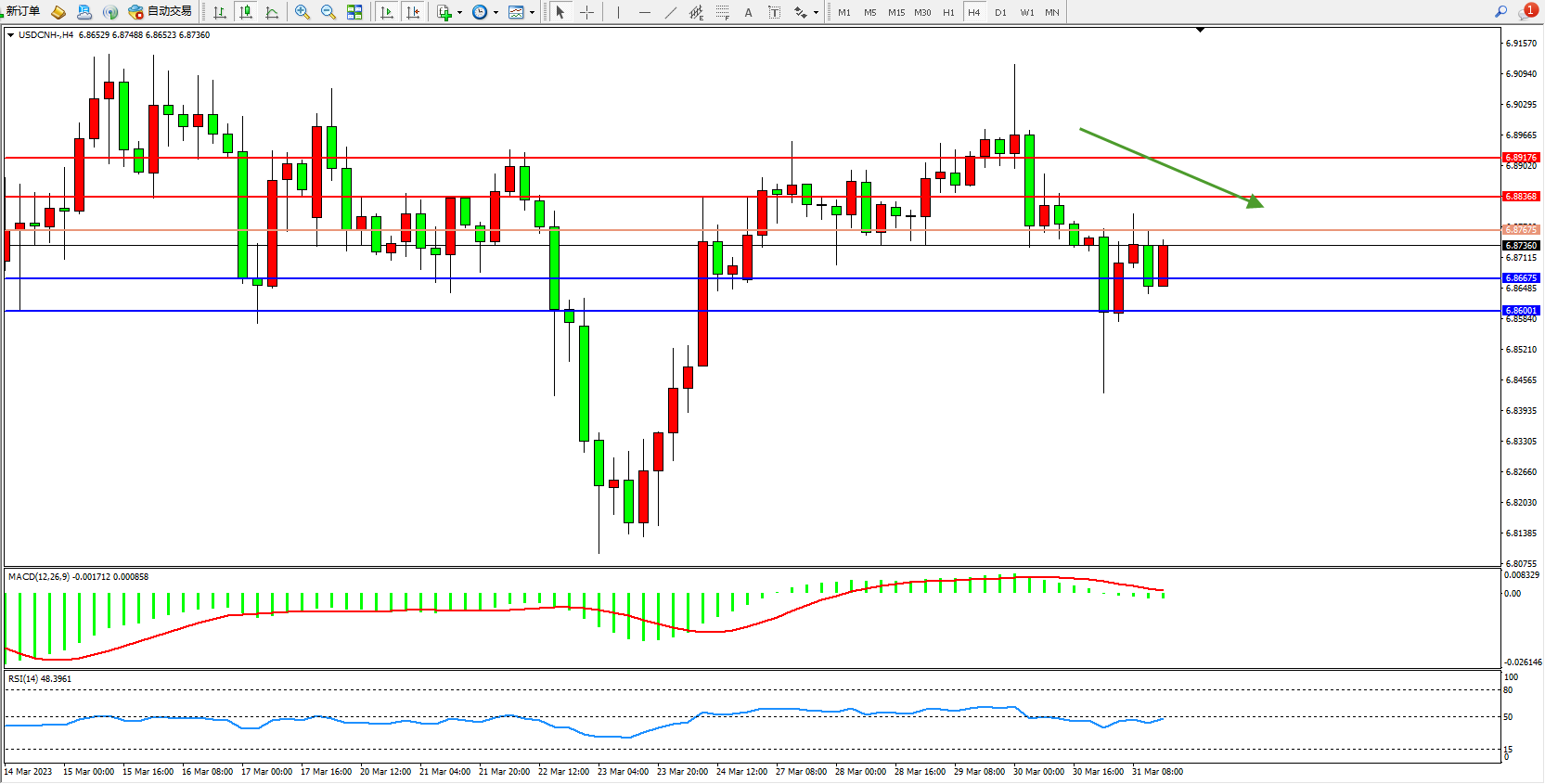 美元人民币USDCNH——4小时K线图显示: