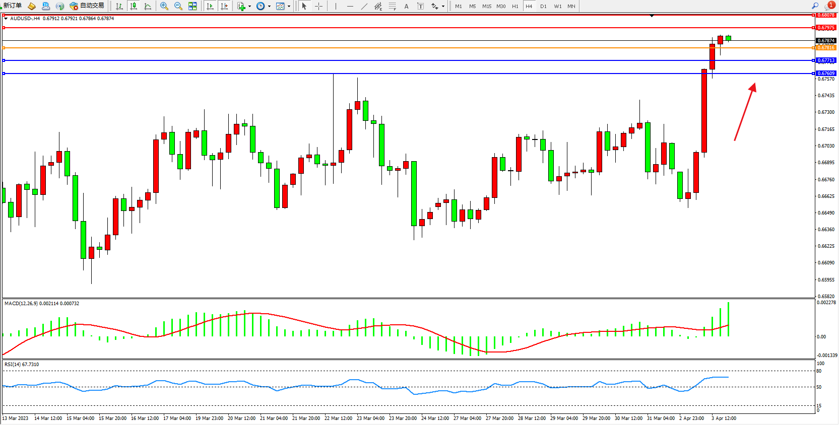 澳元兑美元维持0.67874附近震荡,澳洲联储即将召开政策会议,市场押注在连续10次加息后将首次暂停加息。澳洲联储4月政策会议上维持现金利率3.6%不变的可能性为87%,市场分析今年加息的风险不大。这与月初的情况截然不同,当时认为利率将达到4.1%或更高。
