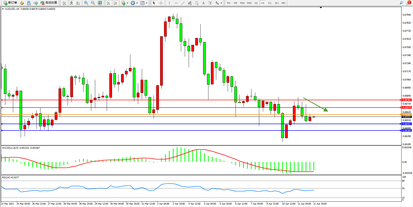交易策略:0.66583下方看跌,目标0.66457  0.66368