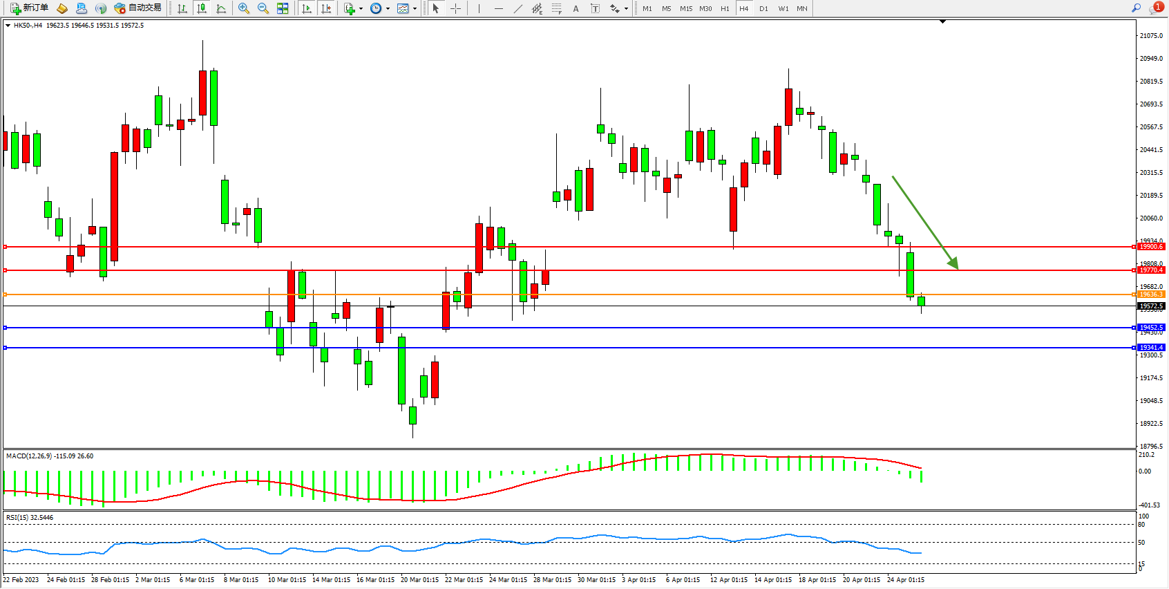 香港恒生指数4月25日(周二)收盘下跌342.06点,跌幅1.71%,报19617.88点;昨日盘后和今日盘前美股第一共和银行闪崩,或引发市场担忧。港股全天呈下跌行情,市场情绪表现低迷,恒生科技指数大跌3.46%,恒指、国指分别下跌1.71%和1.96%,恒指下挫近350点,三者齐刷月内新低价。大型科技股全线下跌,美团、京东跌超4%,此前消息称拜登政府欲限制美企对华投资,半导体股连续下跌,香港政府统计处公布,继2月出口同比下跌8.8%后,3月份商品整体出口货值为3672亿港元,同比下跌1.5%,逊于市场预期增长0.1%,出口连跌11个月。南下资金全日净流入35.02亿港元,大市成交额为1066亿港元。