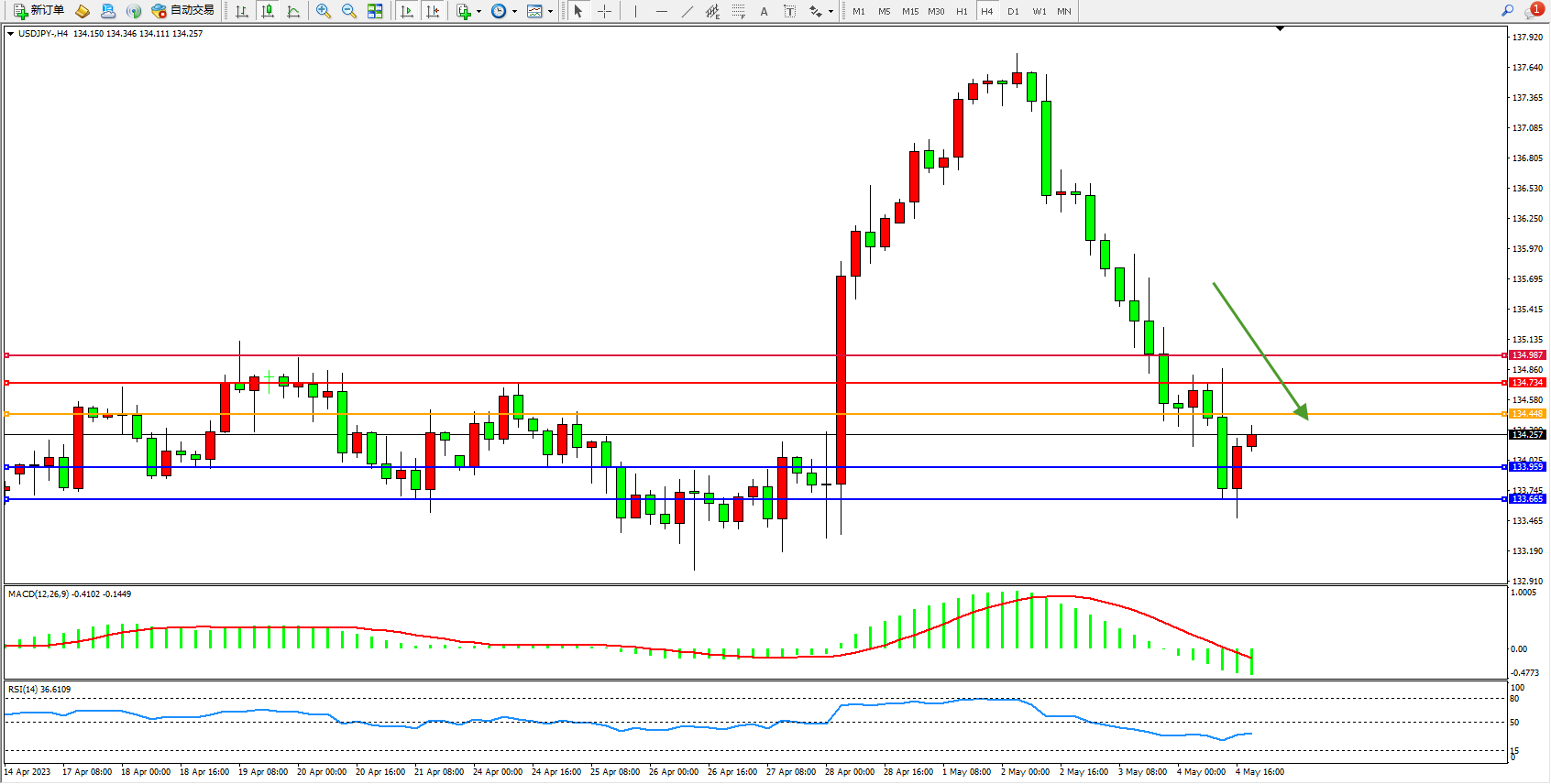 4小时图看:空头下行趋势走势持续,短期跌势低位虽有止步反转走势迹象,但下行趋势持续,MACD指标处于空头区域维持整理,RSI指标处于空头区域维持窄幅震荡;