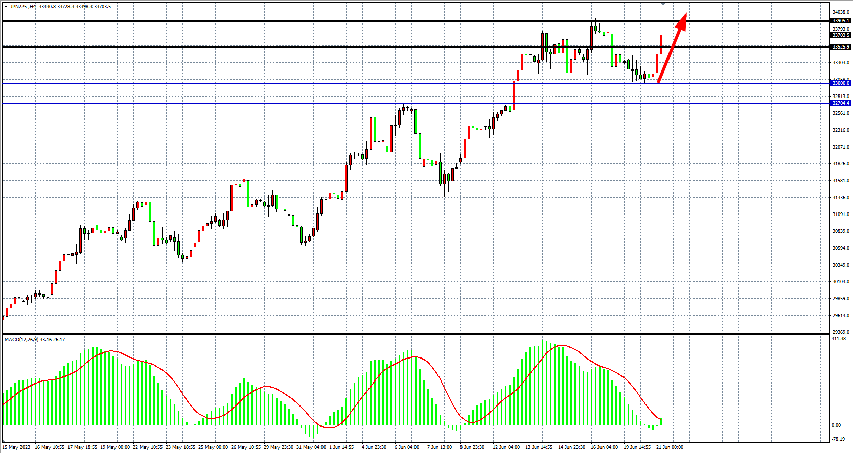 4小时图看,日经指数在33000止跌反弹,MACD量能在零轴附近震荡,行情维持高位盘整,阻力关注33900,支撑关注33500、33000。