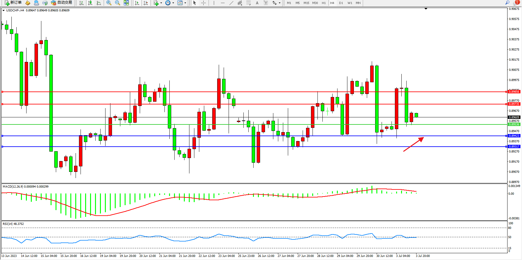 美元瑞郎USDCHF——4小时K线图显示: