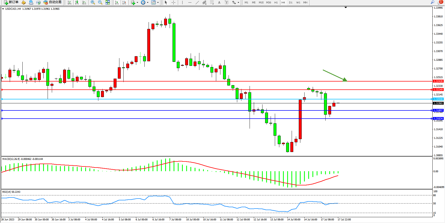 4小时图看:空头动力震荡下移,短期跌势或将持续,市场空头情绪笼罩,MACD指标处于0轴线下侧弱势整理,RSI指标处于50均衡线附近弱势徘徊;