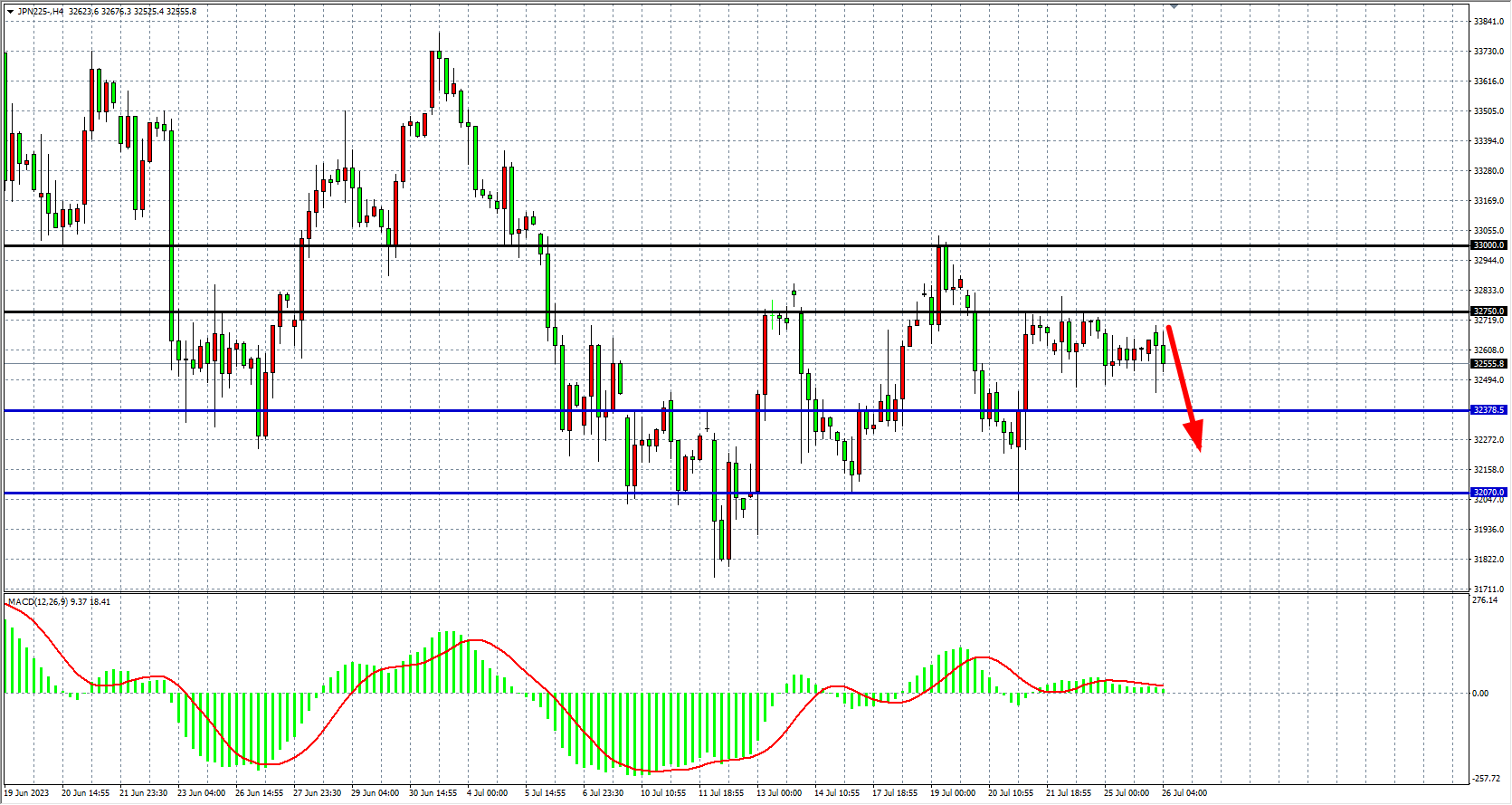 4小时图看,日经指数在32750下方盘整,MACD量能在零轴之上维持缩量状态,行情仍宽幅震荡为主,阻力关注32750-33000,支撑关注32380-32070。