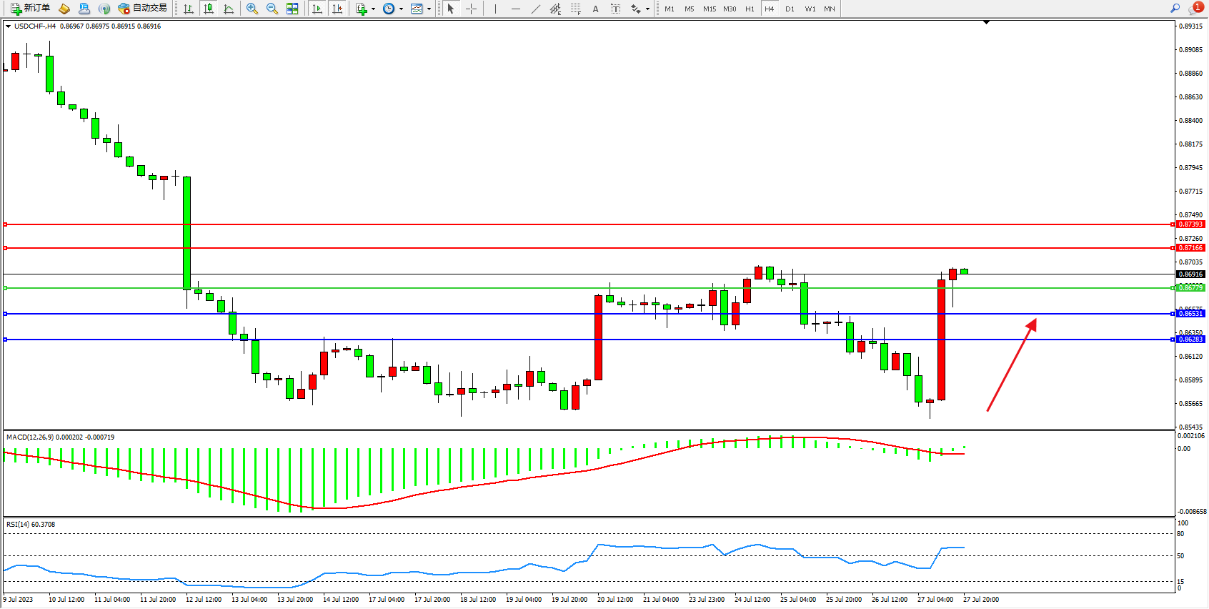 4小时图看:低位多头急速拉升,市场多头情绪笼罩,MACD指标处于0轴线附近震荡,RSI指标处于50均衡线上側多头区域震荡;