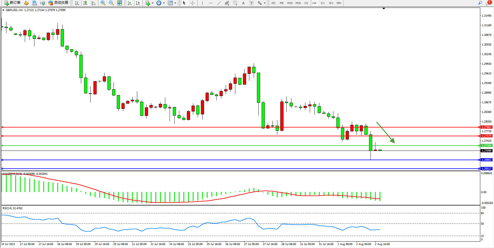 交易策略:1.27266下方看跌,目标1.26802  1.26517