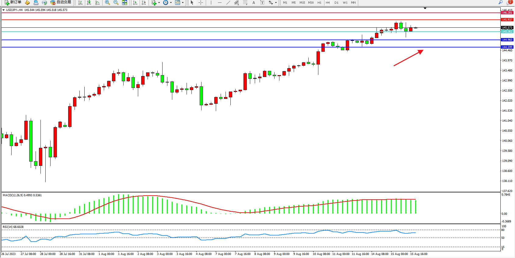 美元兑日圆维持145.573附近震荡,在全球其他央行纷纷加息之际,日本央行仍坚持其超宽松货币政策,这使得其他国家的回报看起来更具吸引力,因此无论在直盘还是交叉盘交易中,均对日元造成了沉重的抛售压力。