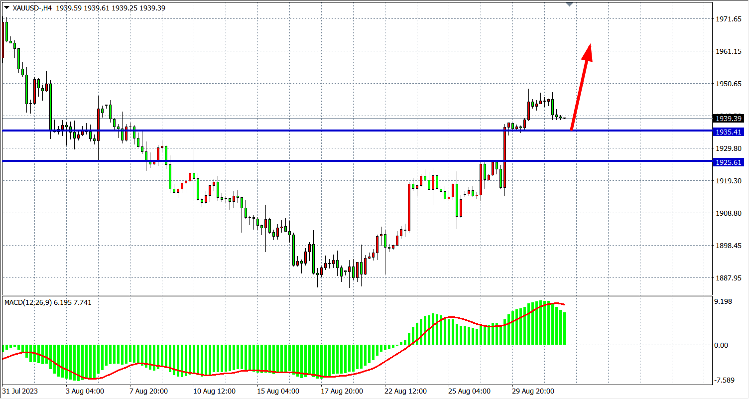 4小时图看,黄金反弹1948附近受阻再度回落,MACD量能维持在零轴上,短线走势仍处多头,支撑关注1935附近,阻力关注上方1955-1970附近。