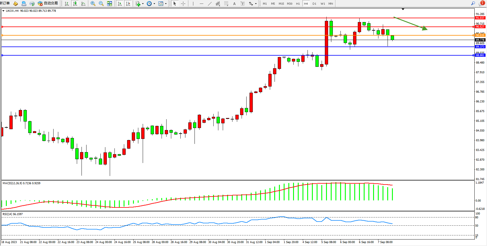 4小时图看:高位短期维持整理,高位多头动力减弱,空头情绪伺机入场,短期有继续回撤震荡走势,MACD指标处于多头区域缓慢回撤,RSI指标处于50均衡线上側弱势徘徊;