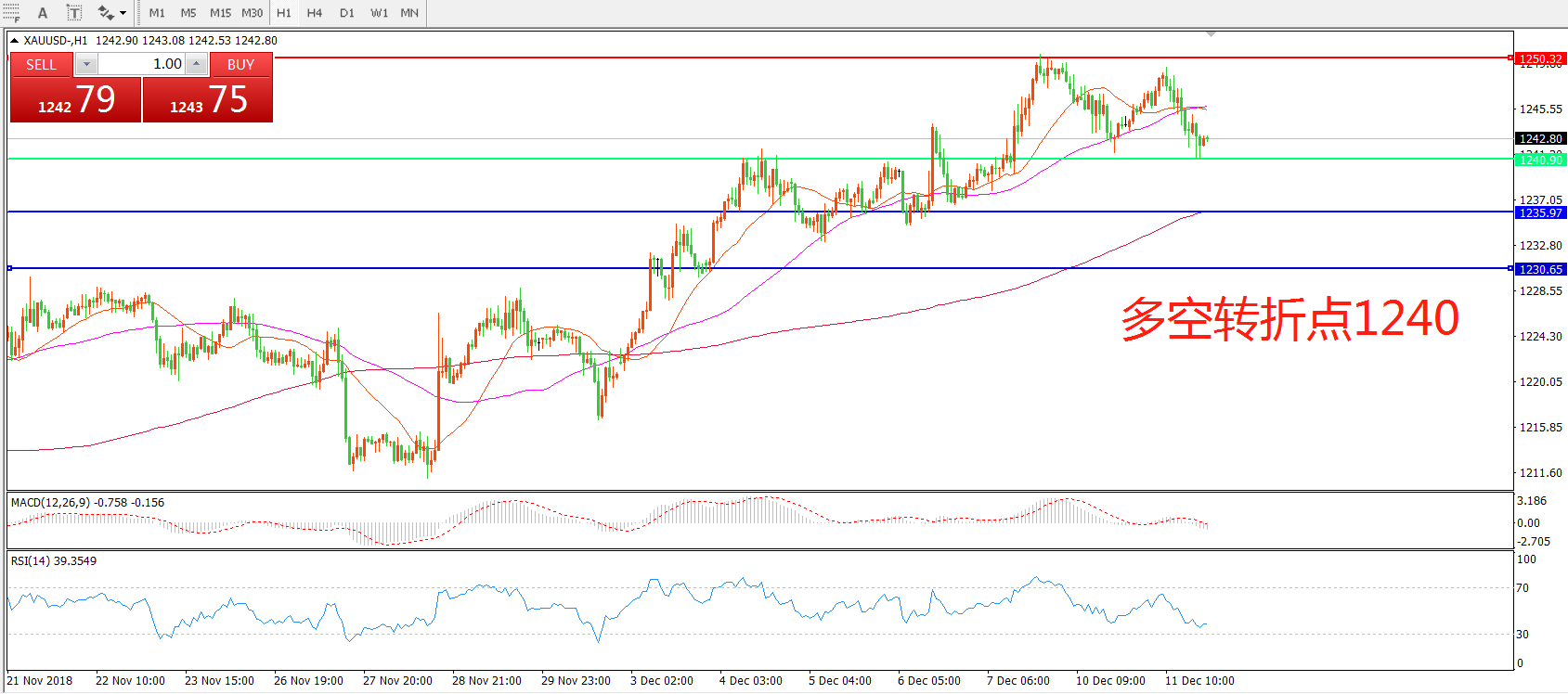 国际现货黄金周二(12月11日)亚市早盘开于1243.92美元/盎司,最低下探至1240.45美元/盎司,最高上探至1249.53美元/盎司,收于1242.90美元/盎司。