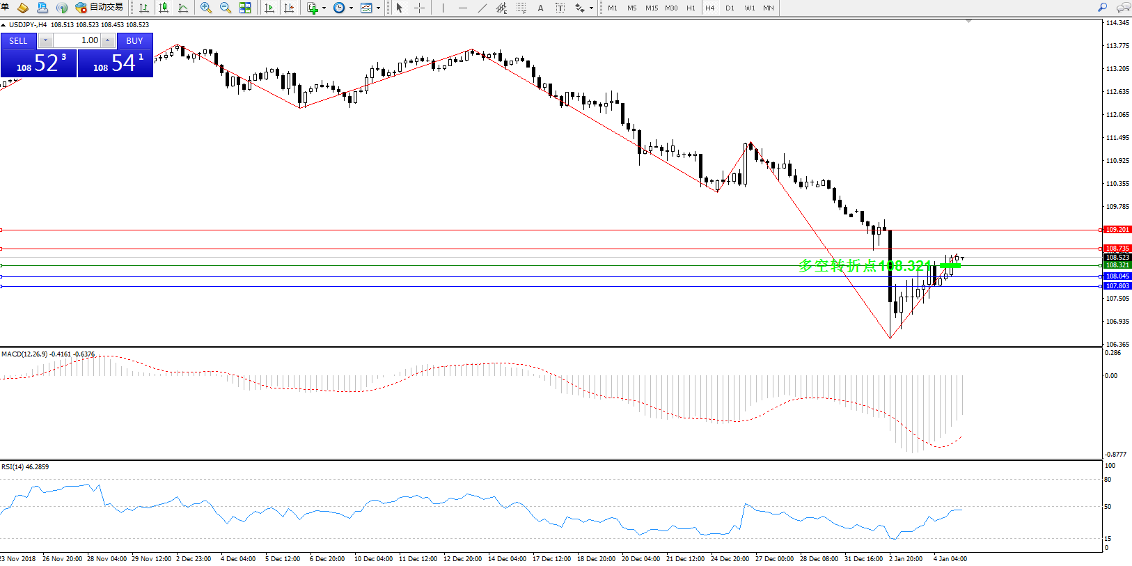 交易策略:108.321上方看涨,目标108.735109.201