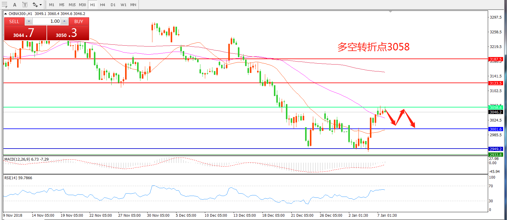 1小时图看,CHINA300中华指数收复3000整继续上行, 3058多空转折点争夺明显,双底结构逐渐形成,短期均线拐头, MACD红柱增加,短线思路震荡偏多。