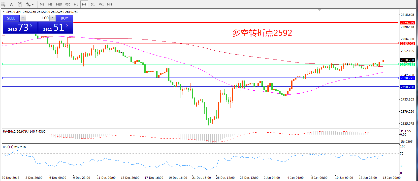 4小时图看,SP500近期逐渐站稳200周期均线,短期55均线有拐头上升迹象,MACD红柱缩短,小幅反弹成为可能。
