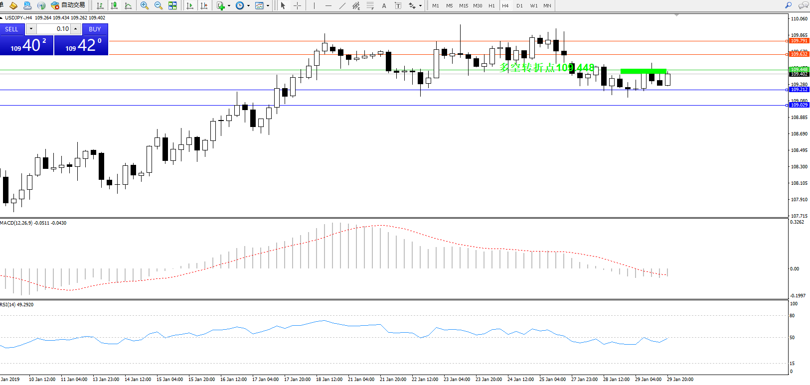 交易策略:109.448下方看跌,目标109.212、109.029
