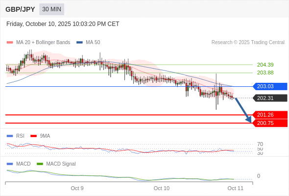 英镑/日元 当日内: 看跌,在 203.03 之下。