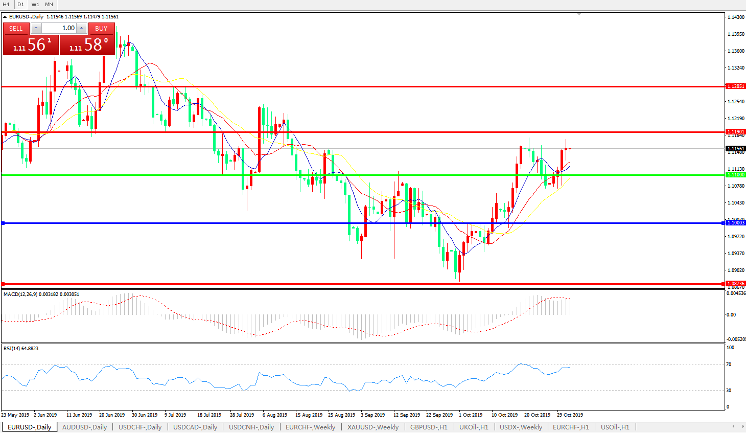 三菱日联银行:欧元兑美元将继续保持积极势头,未来一周看涨;三菱日联银行分析师表示,若市场预期欧洲央行将收紧货币政策,欧元兑美元有望在10月创下2018年1月以来最大月度涨幅。这种积极势头可能在下周得到延续,因疲弱的美国经济数据料将拖累美元,此前美联储降息25个基点后暗示将暂缓降息,投资者并不感到担心。周四公布的美国10月芝加哥PMI显示制造业再次萎缩,预计周五的非农报告显示就业增长放缓,因此未来一周看涨欧元兑美元,预计将持平于1.1150。