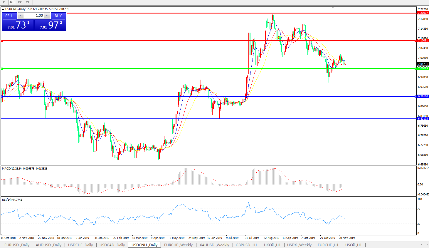 技术面简析:日图均线维持多头排列的迹象,汇价7.0关口上方窄幅整理,MACD运行于0轴下方但量能持续收缩,RSI整理中走低,预计短期汇价将在7.0关口附近整理,中期汇价需等待美元指数及中美贸易谈判最新进展指引。