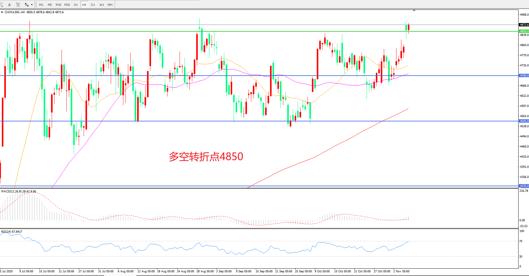 4小时图看,沪深300震荡上行,短期走势有所回暖,21周期均线成为短期支撑,MACD红柱增加,RSI指标向上,日内延续上行概率较大。