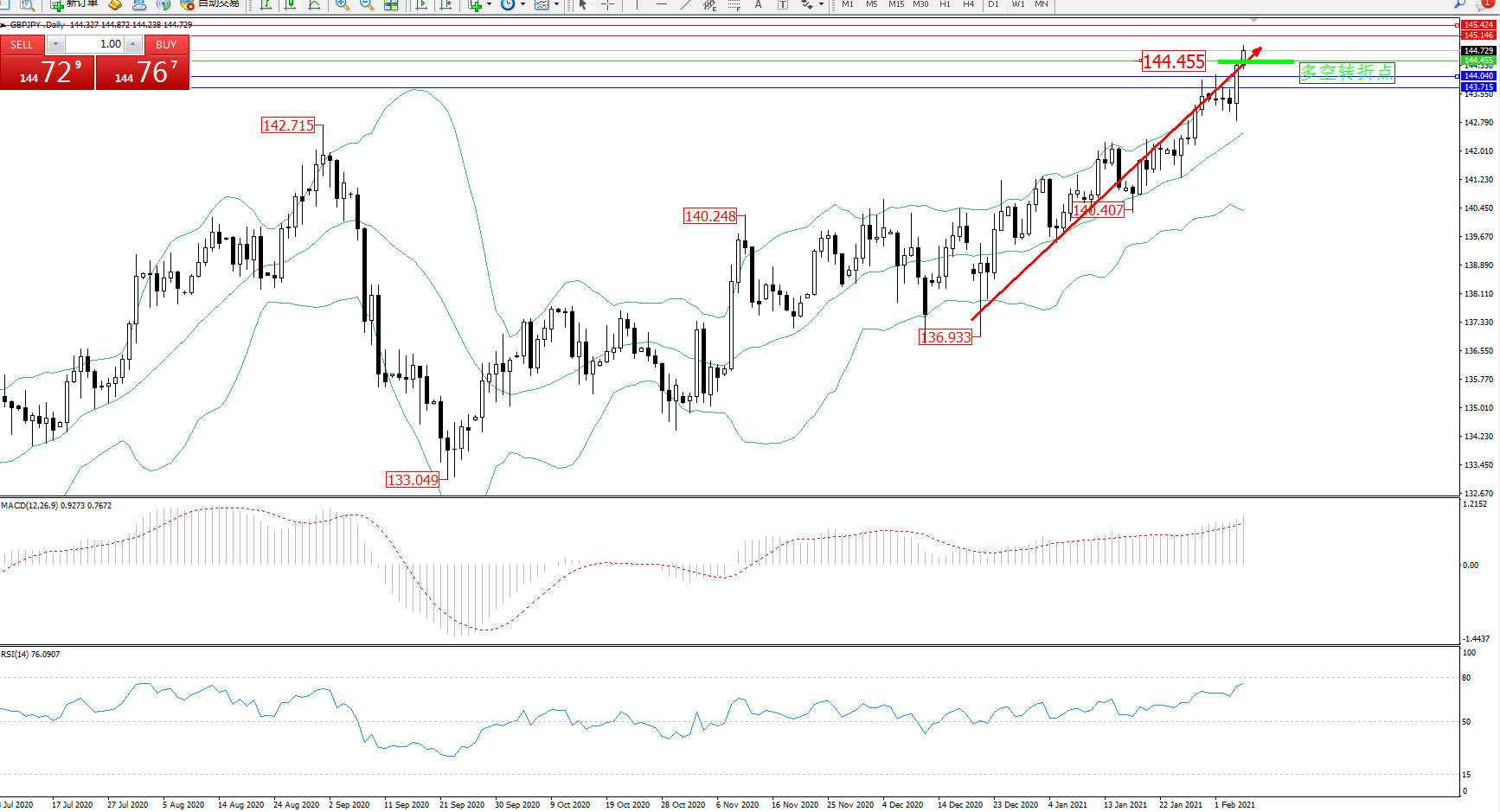 英镑兑日圆持续拉升至144.729附近震荡,根据英国媒体报道,从2月15日起,所有从新冠肺炎疫情高风险地区返回英国的英国国民和居民必须在政府认可的酒店隔离10天。英国文化大臣奥利弗·道登在接受英国广播公司采访时表示,政府“旨在”于2月15日实施新的入境强制隔离计划,适用于30个高风险“红色名单”上的国家和地区,包括最近发现了新冠病毒变异株的几个南美洲和非洲国家。疫苗普及得力,加之脱欧任务完成,疫苗普及得力,加之脱欧任务完成,对英国GDP的预期较英国央行今后18个月的预期更为乐观,也是预期货币政策委员会在2021或2022年不会加大量宽规模或实施负利率政策的原因所在。