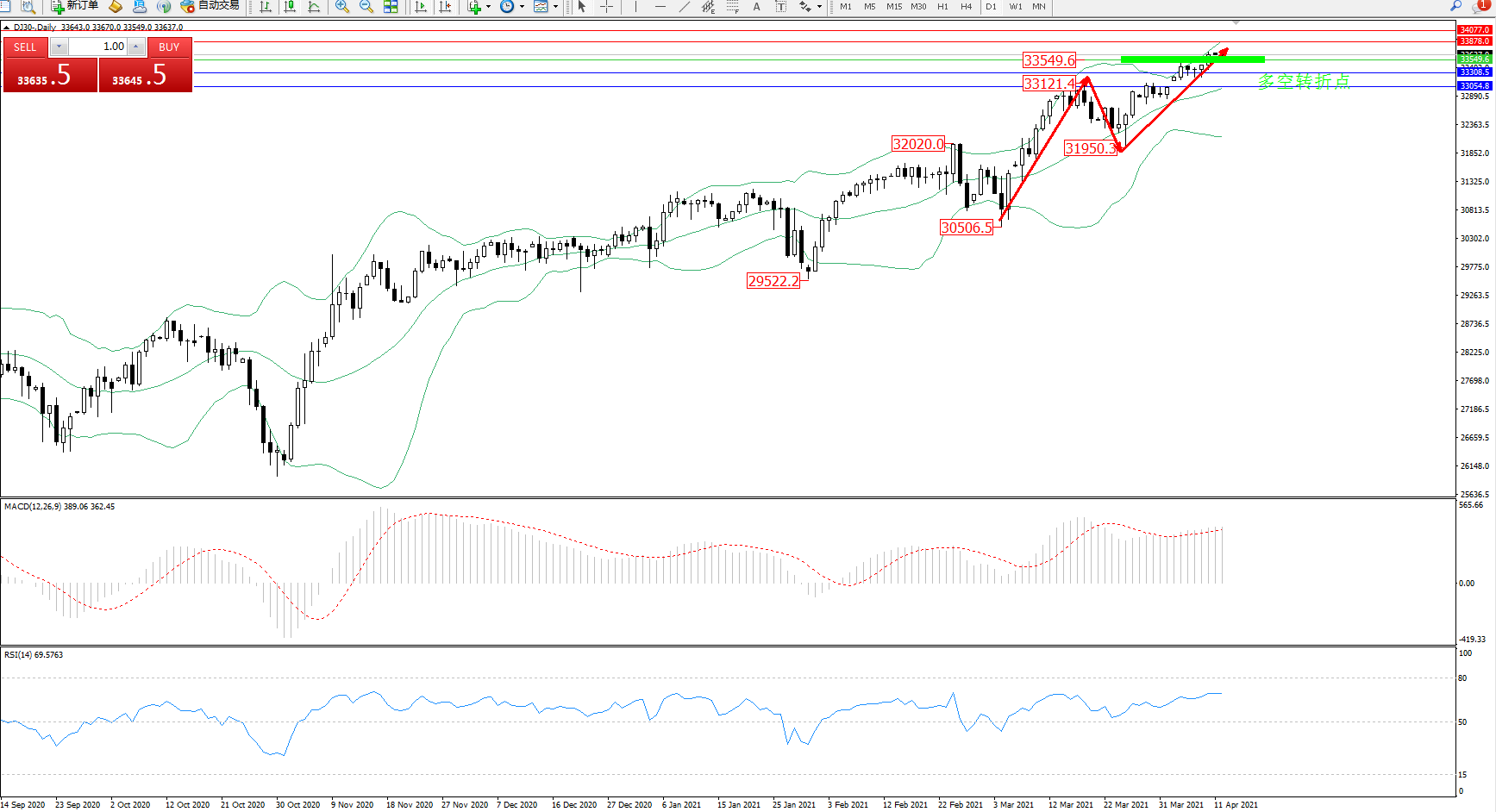 道琼斯指数4月12日(周一)收盘下跌54.74点,跌幅0.16%,报33745.86点;美股收盘,道指初步收跌,美国股市从创纪录高点整理下滑,投资者权衡刚刚拉开序幕的财报发布季的业绩表现;英特尔领跌科技股,此前英伟达表示将推出该公司第一款服务器微处理器,进一步杀入英特尔最赚钱的市场领域;摩根大通、花旗、美国银行、摩根士丹利、高盛等银行和金融机构将开始陆续发布第一季度业绩;投资者担心拟议的基建法案将对企业盈利产生影响,如果税率从21%提高三分之一至28%,那么对利润是个巨大冲击。如果大宗商品确实进入了另一个超级周期,那么最近的基金持仓调整表明一些投资者对此仍有疑虑。基金经理们已将对大宗商品的净多头头寸减少至去年12月来最低,此前曾达到至少十年来最高。因磕磕碰碰的经济重开努力迫使投资者重新考虑押注经济复苏的交易。
