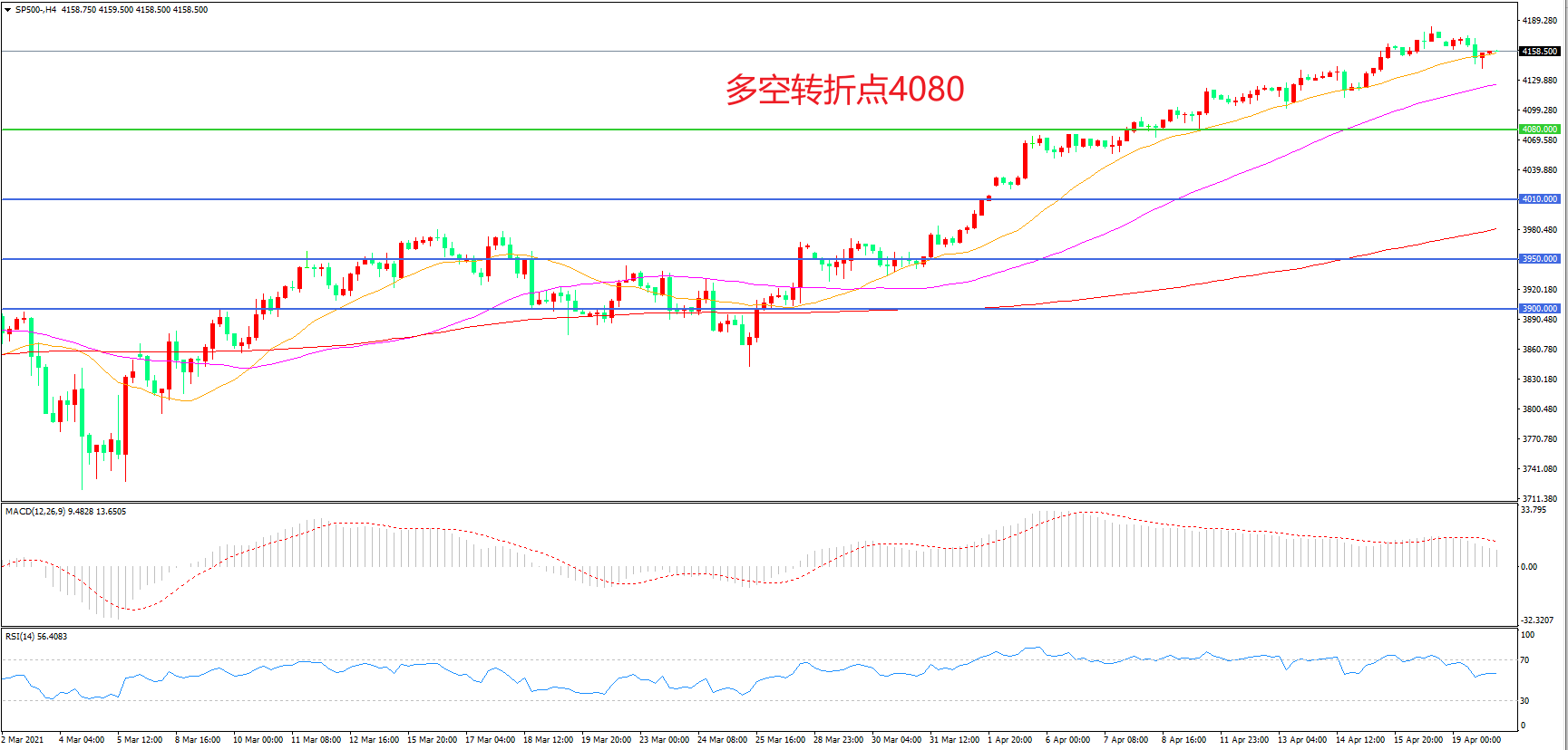 4小时图看,标普500大幅拉升后延续高位震荡,整体表现偏强,下方低点逐步抬高,多头趋势仍然明显,MACD红柱减少,RSI指标走平,日内延续震荡概率较大。